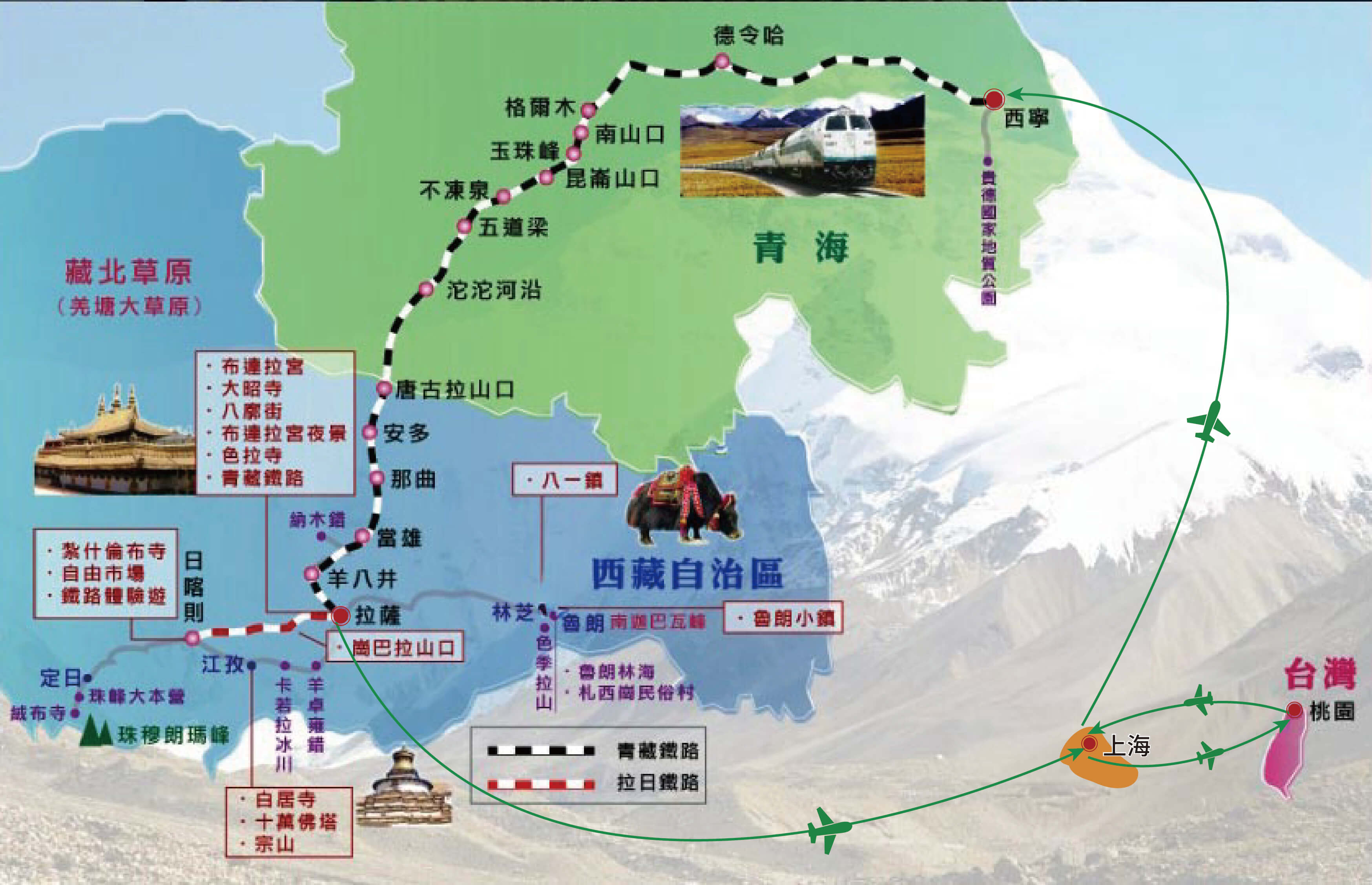 ●行車距離:西寧(海拔2100米)→ 青藏鐵路 約1956公里 車時約22小時 →拉薩