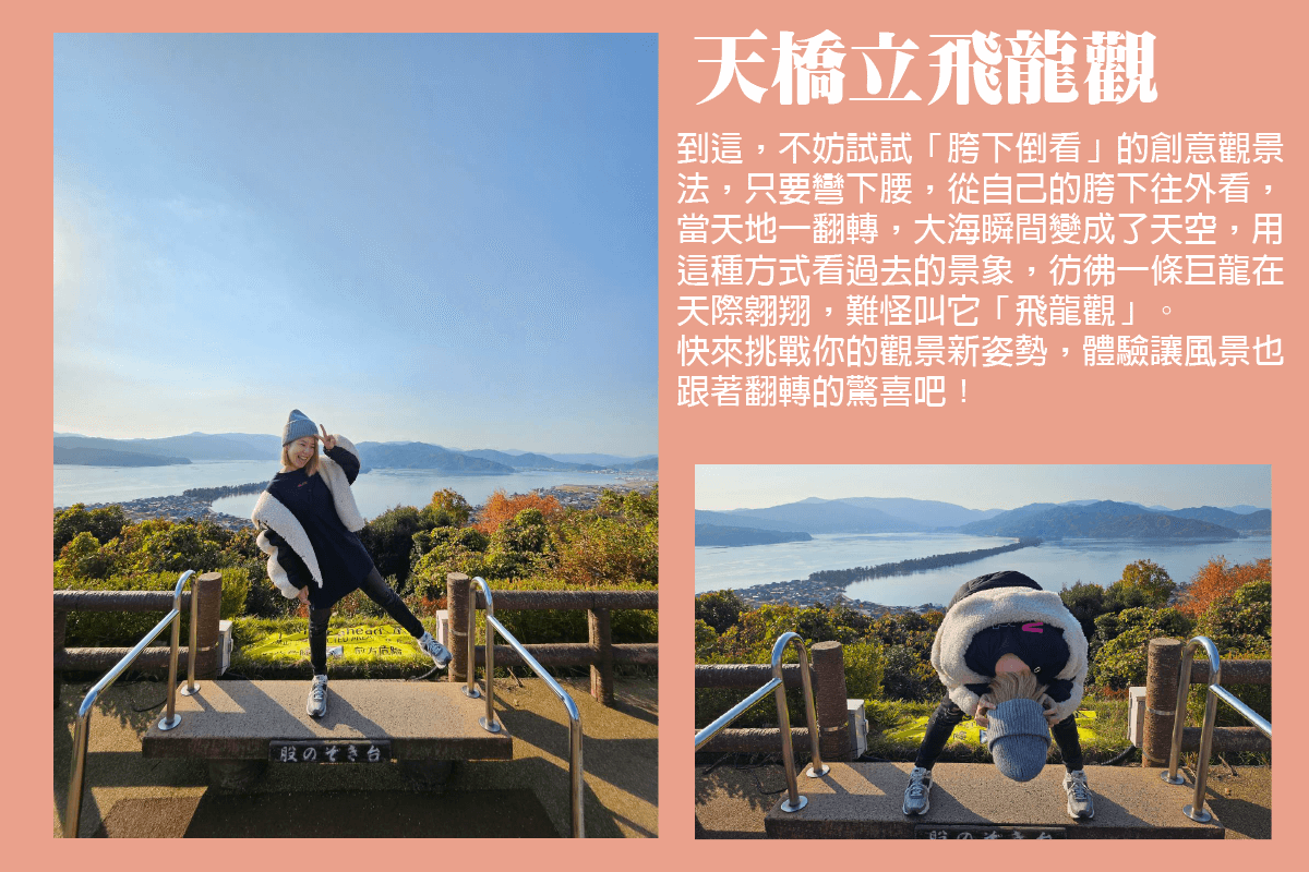 【天橋立】這地名,相傳是指人們如果站在沙洲北端的傘松公園或南端的飛龍觀兩處地勢較高的山頭,背對著沙洲站立並低頭從自己的跨下朝後望時,會看到沙洲猶如一條往天上斜伸而去的橋樑,因而得名,傳說中,天橋立原本是天界通往人間的橋,但有一次天神伊邪那岐在睡午覺時不小心把它弄倒,於是天橋就躺倒在宮津灣內。實際上,天橋立是因為潮流帶來的沙子經過長時間淤積而成,特別的是,沙洲上長滿的松樹,數量高達8000多顆,最老的有數百年以上。